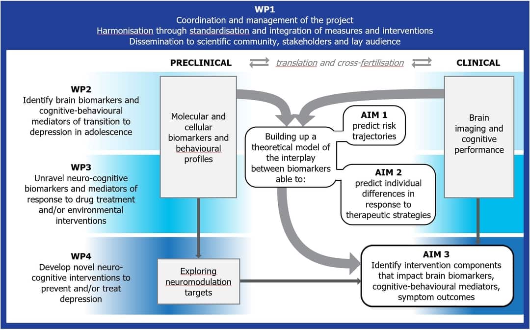 The causal role of cerebral or environmental factors on the deviations of cognitive functions and behaviours, and on intervention response, will be tested in animal studies and using existing databases from at risk youth. The ADORe consortium will conduct researches on humans and animals, aiming to provide novel intervention components for at-risk individuals during the critical adolescent period. The researches will be focused on core brain regions and cognitive functions (reward, memory, stress response, and self-referent thinking) developing in adolescence, and relevant to depression risk. In the final year of the project, promising targeted neurocognitive interventions will be identified, adapted and tested at proof-of-concept level in two at-risk adolescent samples: one resistant to psychosocial intervention and the other exposed to severe childhood adversity.